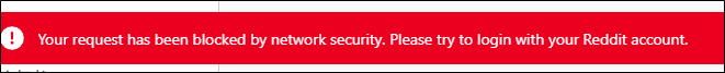 Your request has been blocked by network security. Please try to login with your Reddit account.